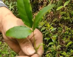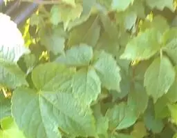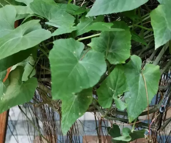 单叶互生,叶色深绿,阔卵形,叶长8~13厘米、叶宽7~11厘米。叶尖渐尖,叶基心形,叶缘微具钝齿,齿凹处有不明显软刺。叶柄绿色,长约2~4厘米,叶脉为羽状脉,叶面平展。