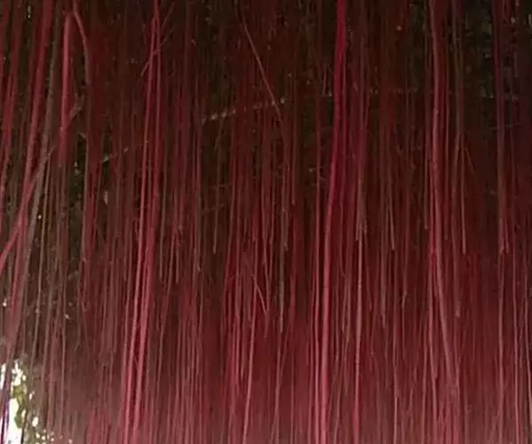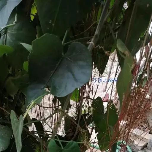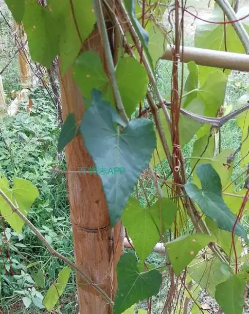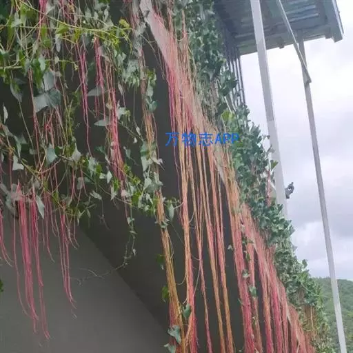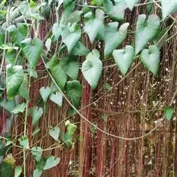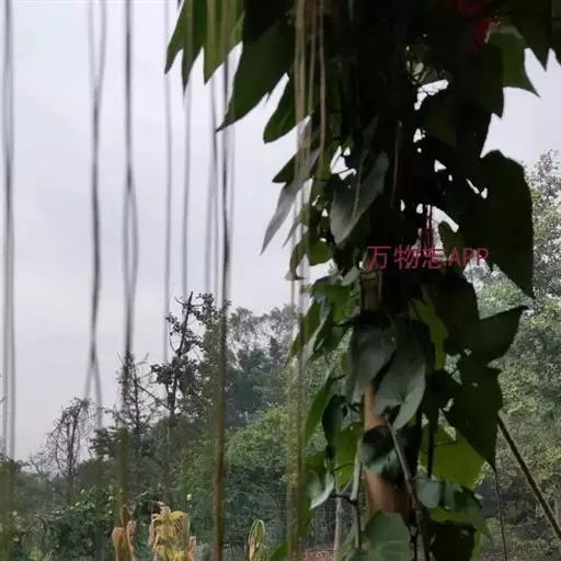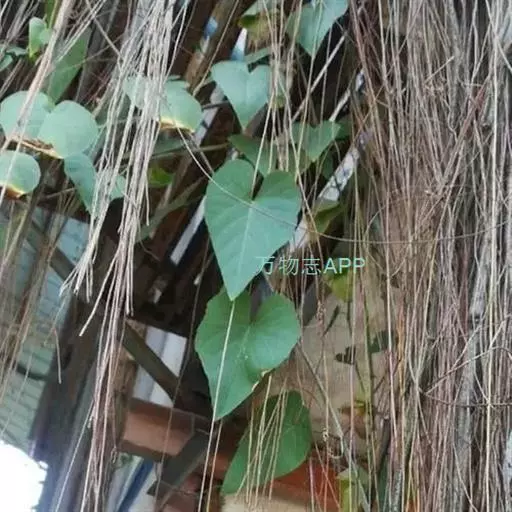 锦屏藤 多年生常绿草质藤蔓植物,具卷须,与叶对生;攀援茎,茎蔓草质柔韧,呈扁形或圆柱形,老茎蔓呈灰白色,表皮粗糙,嫩茎青绿色,表皮光滑油亮,主蔓粗度达2~3厘米,蔓长10~15米;气生根线形,着生于茎节处,每节可长出5~7条气生根,短截的气生根可分生多条侧根,下垂生长。初生气根紫红色,质地光滑脆嫩,老熟气根黄绿色,质地粗糙柔韧,长度可达3~4米或更长。