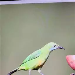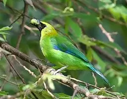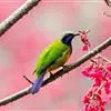 橙腹叶鹎体形大小和金额叶鹎相似,体长16~20厘米。额至后颈黄绿色,其余上体绿色,小覆羽亮钴蓝色,…