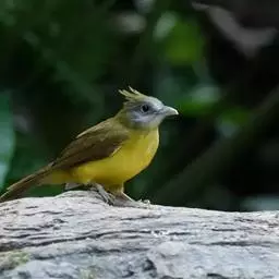 黄腹冠鹎:体长19-24厘米,是一种体型略大的褐色鹎。头顶橄榄褐色具黑褐色羽冠。白色的喉膨起,…
