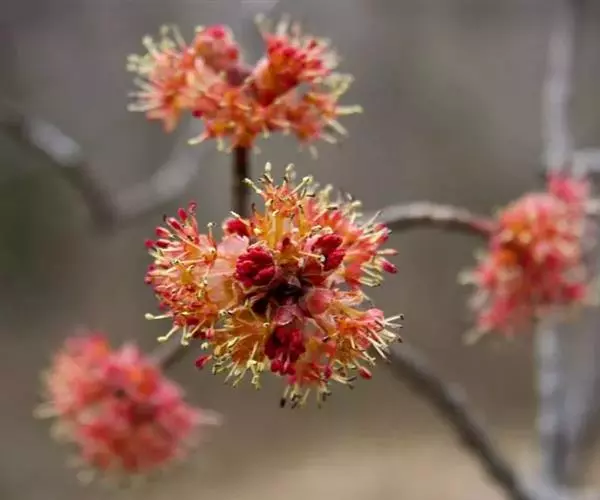头状花序生于当年枝的叶腋内,有花4-5朵,花序柄长约1厘米,有星毛;花无花梗,萼筒浅杯状,长约1毫米,外侧有灰褐色星毛,萼齿卵圆形,长3毫米,先端圆形;花瓣及雄蕊未见;子房近于上位,基部与萼筒合生;有星毛;花柱长2毫米,先端尖,花后稍伸长。蒴果近圆形,长8-9毫米,先端有短的宿存花柱,干后2片裂,每片2浅裂,萼筒长不过2.5毫米,边缘与果皮稍分离。种子纺锤形,长6-7毫米,两端尖,褐色有光泽,种脐浅黄色。5月开花。