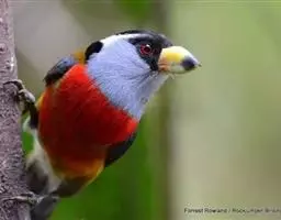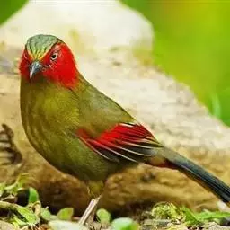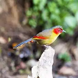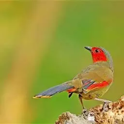 赤尾噪鹛中型鸟类,体长24~28厘米。头顶至后颈红棕色,两翅和尾鲜红色,眼先、眉纹、颊、颏和喉黑色,…