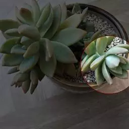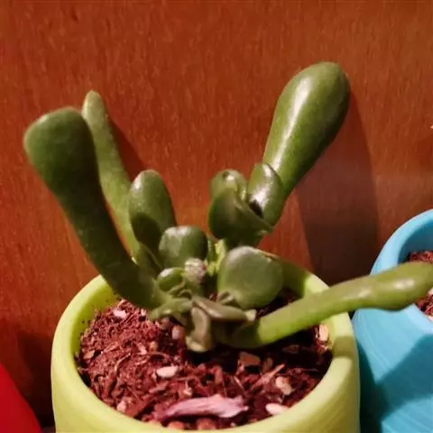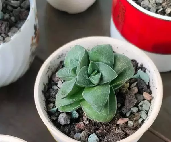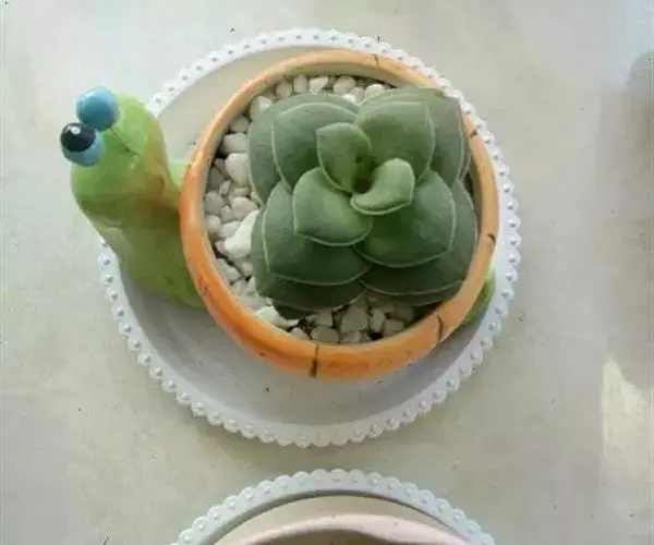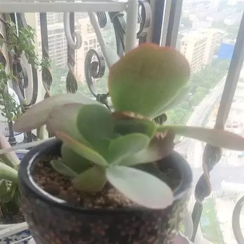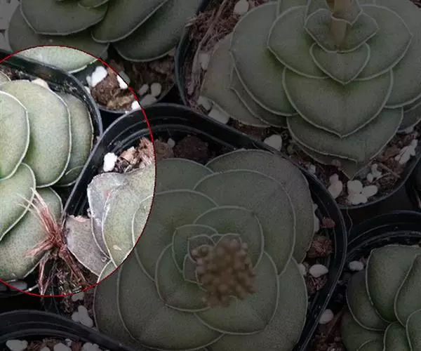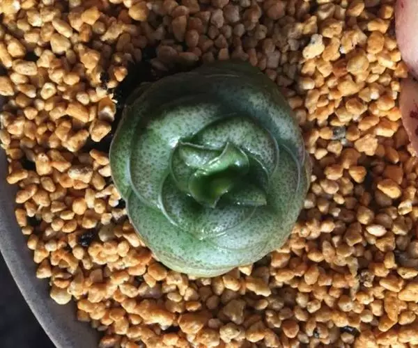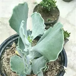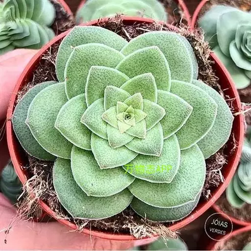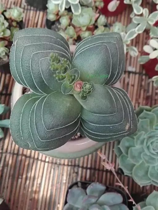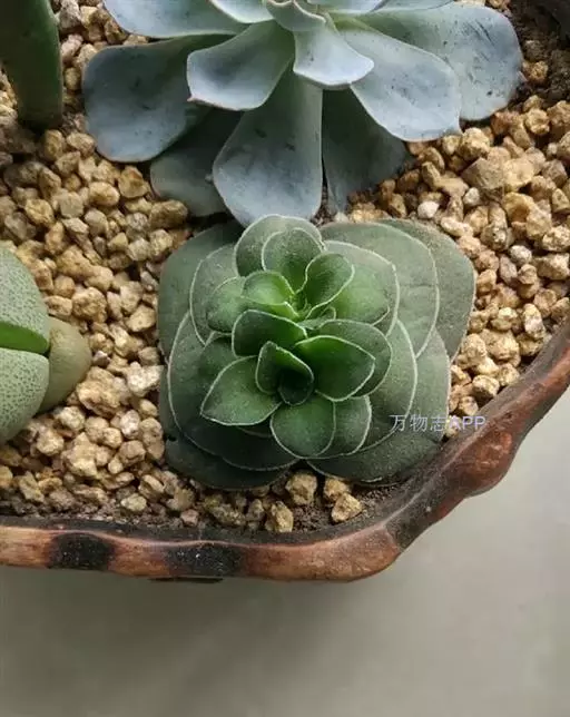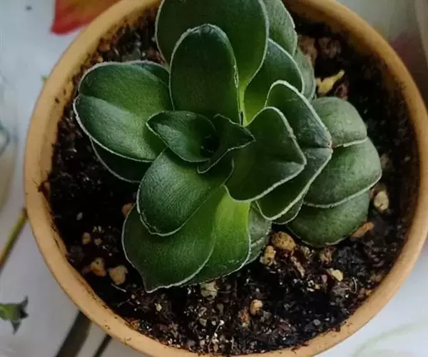 巴的植株具短茎,肉质叶半圆形,交互对生,上下叠接呈十字形排列,叶面绿色,有光泽,叶面密生细小疣突而略显粗糙,顶端有椭圆形尖头,整个叶缘有白色毫毛,看起来就象镶上的白边,植株基部易生侧芽。