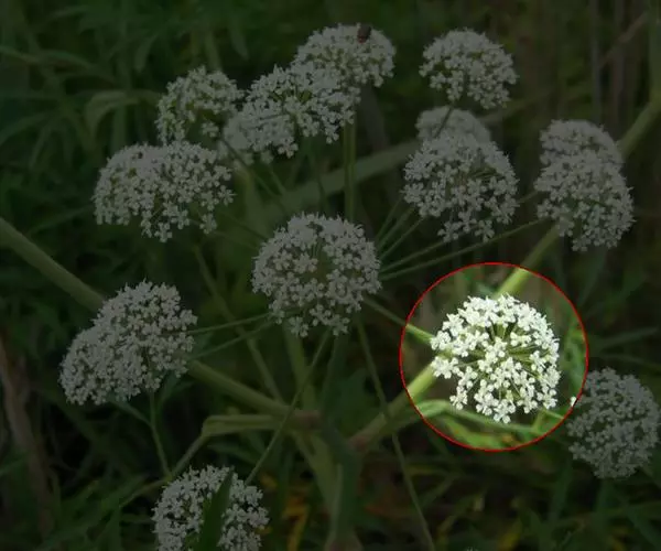 复伞形花序顶生,花序梗长2-16厘米;无总苞;伞辐6-16,不等长,长1-3厘米,直立和展开;小总苞片2-8,线形,长约2-4毫米;小伞形花序有花20余朵,花柄长2-4毫米;萼齿线状披针形,长与花柱基相等;花瓣白色,倒卵形,长1毫米,宽0.7毫米,有一长而内折的小舌片;花柱基圆锥形,花柱直立或两侧分开,长2毫米。