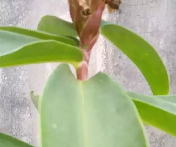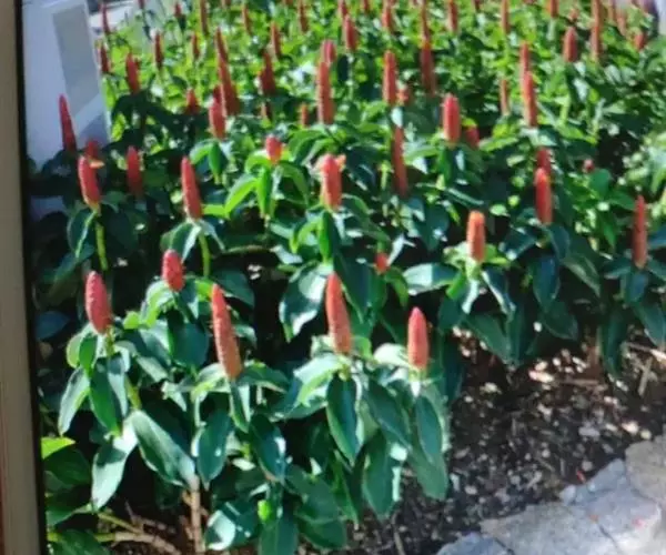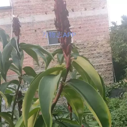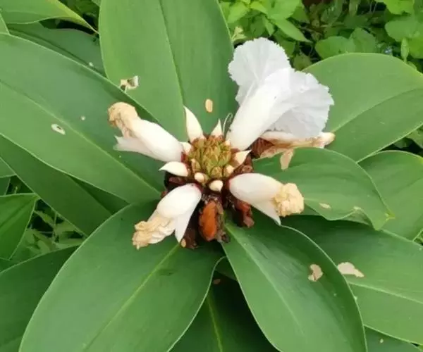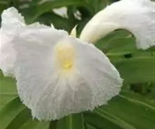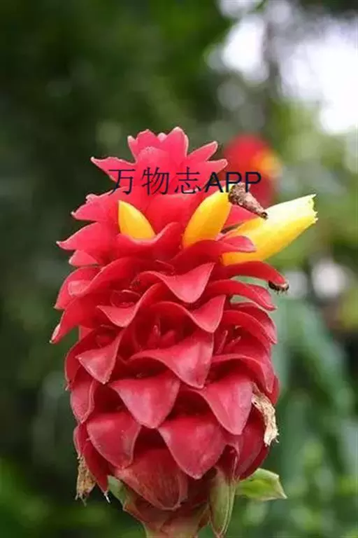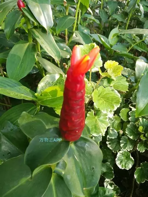 株高1-3米,基部近木质,顶部常分枝,旋卷。叶片长圆形或披针形,长15-20厘米,宽6-10厘米,顶端渐尖或尾状渐尖,基部近圆形,叶背密被绢毛。穗状花序顶生,椭圆形或卵形,长5-15厘米;苞片卵形,革质,红色,长2厘米,被短柔毛,具增厚及稍锐利的短尖头;小苞片长1.2-1.5厘米,淡红色;花萼革质,红色,长1.8-2厘米,3裂,嫩时被绒毛;花冠管短,长1厘米,裂片长圆状椭圆形,长约5厘米,白色或顶部红色;唇瓣宽喇叭形,纯白色,长6.5-9厘米,顶端具裂齿及皱波状;雄蕊花瓣状,长约4.5厘米,宽1.3厘米,上面被短柔毛,白色,基部橙黄。蒴果稍木质,长1.3厘米,红色;种子黑色,光亮,长3毫米。花期:7-9月;果期:9-11月。