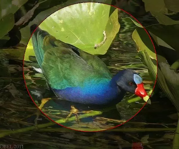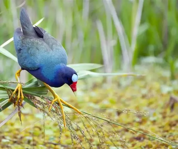 紫水鸡脚上虽然没有蹼,但却会游泳、潜水。它们生活在水边水草繁茂的地方,有时也会游到水面较宽阔的地方去寻找食物。其食物以植物为主,也食一些螺类和水栖昆虫。