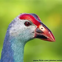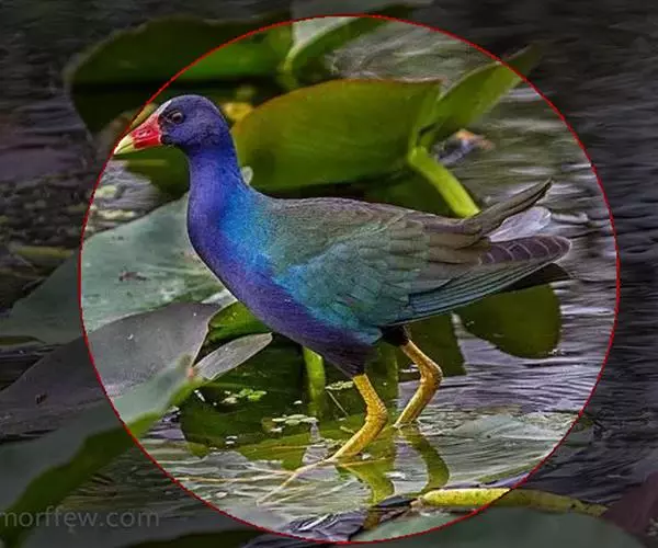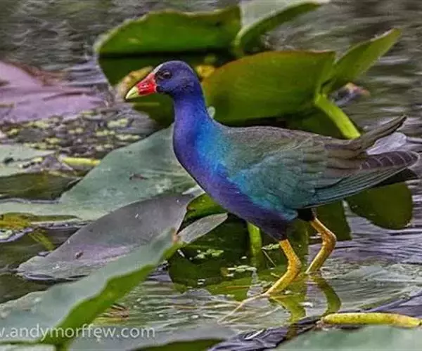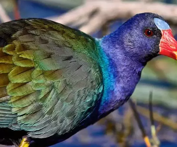 这种紫水鸡非常美丽,体羽有亮丽的光泽。额顶有一块亮青色的额甲,在这之下是鲜艳的红鼻瘤。嘴粗壮,短而侧扁;鼻沟浅而宽,鼻孔小而圆,在鼻沟前部下方,额甲宽大,后缘呈截形。翅圆形,第2枚、第3枚和第4枚初级飞羽最长,并几乎等长;第1枚和第6枚或第7枚初级飞羽等长。跗蹠和趾都长而有力;能用脚趾抓住和操纵食物,两性同型,体羽为紫色或蓝色,尾下覆羽略淡。