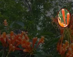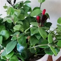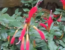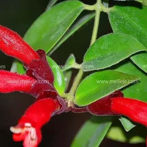 叶对生,长卵形,全缘,叶面浓绿色,叶背浅绿色。花序多腋生或顶生,花萼筒状,黑紫色披绒毛,花冠筒状,红色至红橙色,从花萼中伸出。花期主要在夏季。