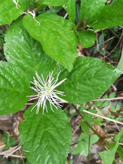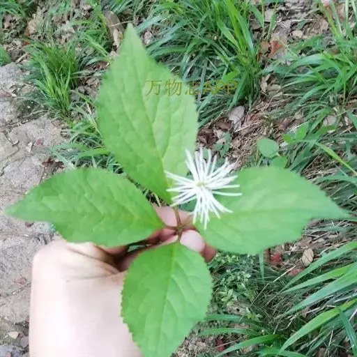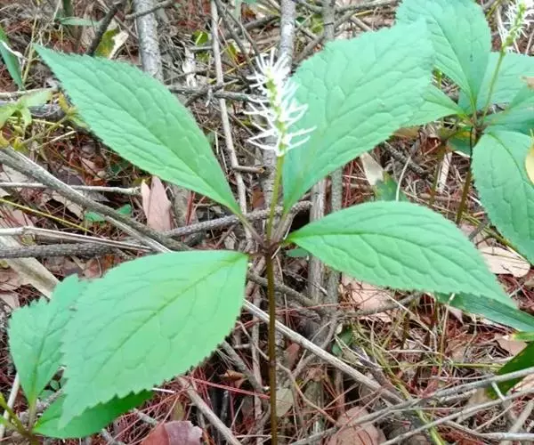 多年生草本,高15-40厘米,全部无毛;根状茎粗短,密生多数细长须根;茎直立,单生或数个丛生,下部节上对生2片鳞状叶。叶对生,通常4片生于茎上部,纸质,宽椭圆形、长椭圆形或倒卵形,长5-11厘米,宽3-7厘米,顶端短尖,基部宽楔形,边缘有圆锯齿或粗锯齿,齿尖有一腺体,近基部全缘,嫩叶背面密生细小腺点,但老叶不明显;侧脉4-6对,网脉明显;叶柄长1-1.5厘米;鳞状叶三角形;托叶条裂成钻形。穗状花序单一,由茎顶抽出,连总花梗长4-6厘米;苞片倒卵形,通常2-3齿裂;花白色,有香气;雄蕊3枚,药隔基部合生,着生于子房上部外侧,中央药隔具1个2室的花药,两侧药隔各具1个1室的花药,药隔伸长成丝状,直立或斜上,长1-1.9厘米,药室在药隔的基部;子房倒卵形,无花柱。核果球形,淡黄绿色,有纵条纹,长约3毫米,近无柄。花期4-5月,果期5-6月。