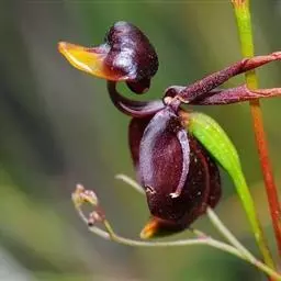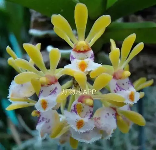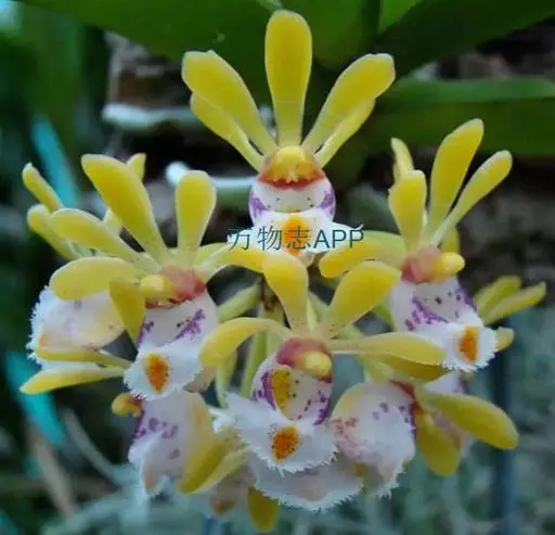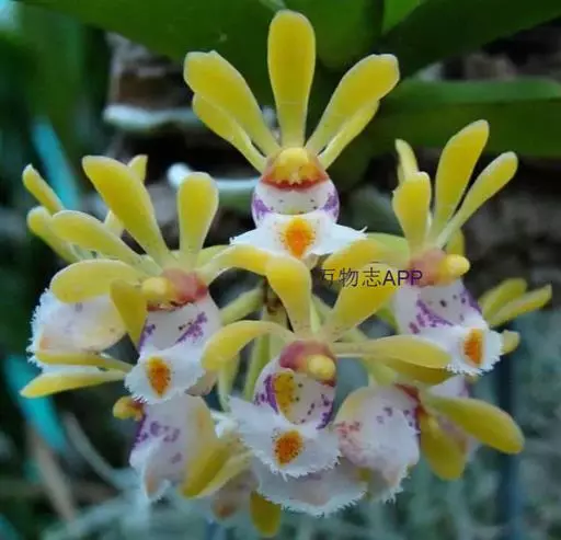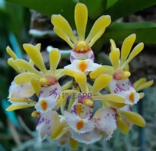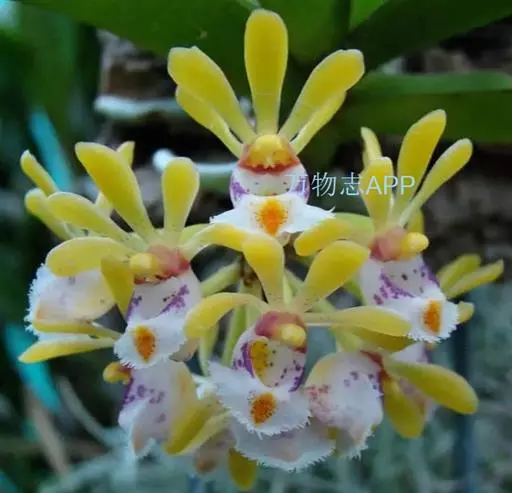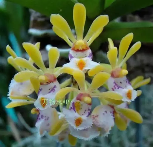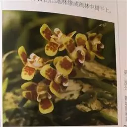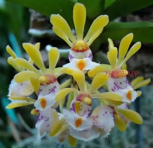 无茎盆距兰(学名:Gastrochilus obliquus (Lindl. ) Kuntze):茎粗短,长1-2厘米,具3-5枚叶。叶二列,稍肉质或革质,长圆形至长圆状披针形,先端钝并且不等侧2裂。花序近伞形,1-4个,出自茎的基部侧旁,常具5-8朵花;花芳香,萼片和花瓣黄色带紫红色斑点;萼片几等大,近椭圆形,花瓣匙形,比萼片小,先端钝;前唇白色,近三角形,长约5毫米,宽8-10毫米,末端外侧黄色带紫红色斑点,具3条脊。花期通常10月。