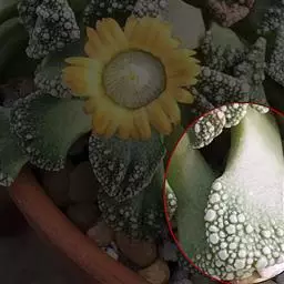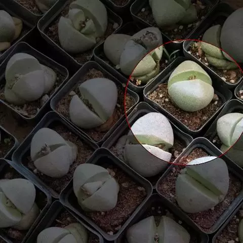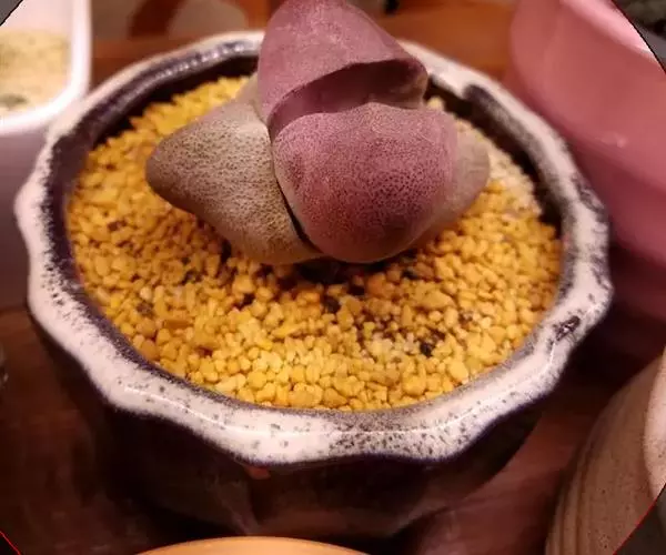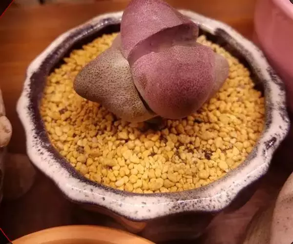 荒玉为番杏科生石花属,原产南非。株体呈白粉色,表面布满凹凸纹路,凹陷处为红褐色,每年秋季开黄花。