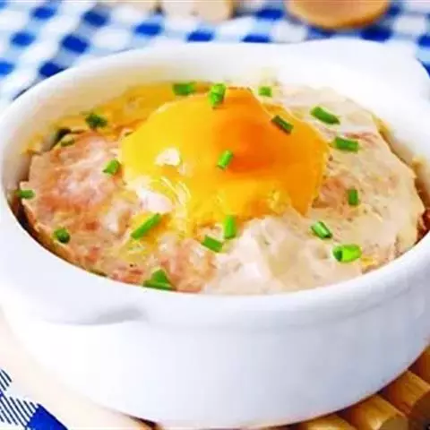 ④将拌好的牛肉糜,嫩豆腐均匀地倒入器皿中。