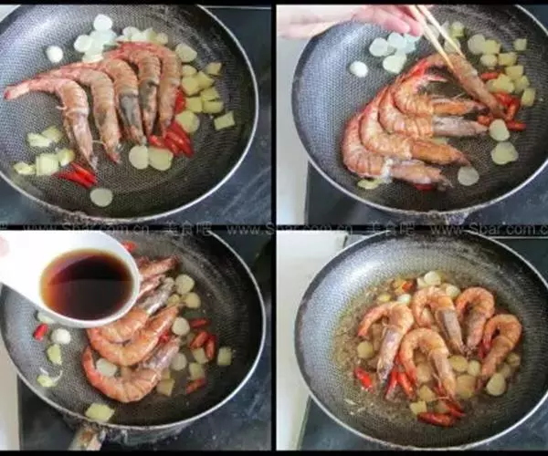 3、烹调干烧大虾时,切记不可上色过重,不宜添加老抽,否则成菜色泽发黑,不美观。