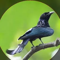 发冠卷尾是中型鸟类,体长28-35厘米。通体绒黑色缀蓝绿色金属光泽,额部具发丝状羽冠,…