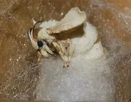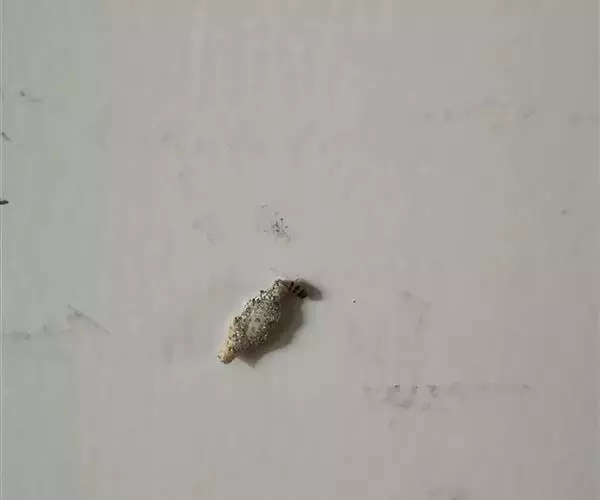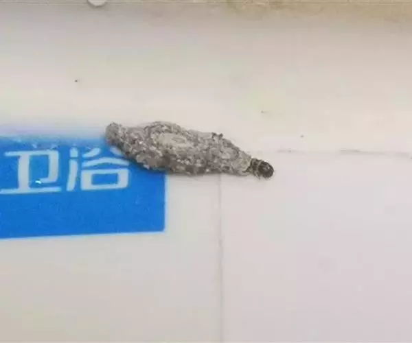 衣蛾,幼虫是一个小型褐色的毛毛虫,一般藏在丝质的袋状物或网状物(称为筒巢)内,在墙壁上可见到一个黏着水泥的纺锤形丝袋,内有一深褐色头的幼虫。成虫为浅黄色的蛾子,惧光。如将其按死,会发出难闻气味。
