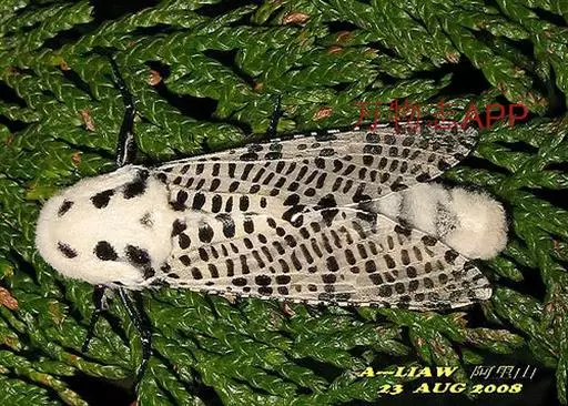 翅展44~68mm;触角黑色;胸部白色,背面有3对黑斑点。雄性前翅脉间密布规则排列的黑色细短纹。腹部白色,每节有黑色横带。