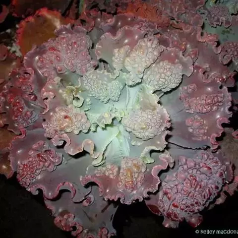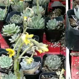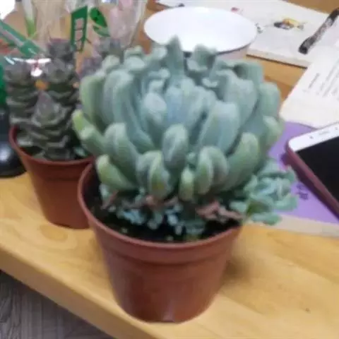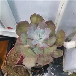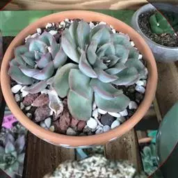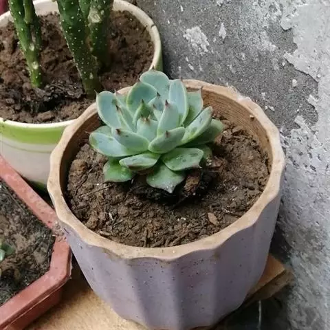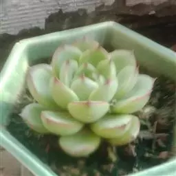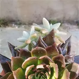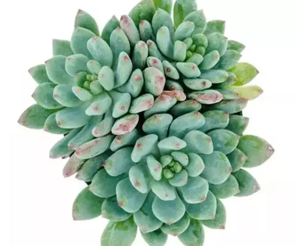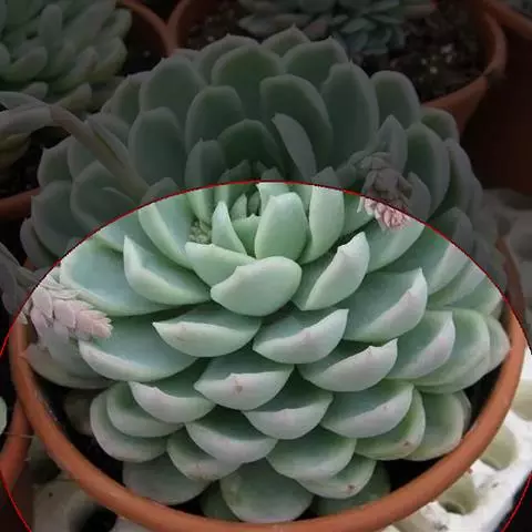 花乃井拟石莲花属多肉植物,植株小型或微型,直径在3-5厘米,叶片肉质肥厚,匙形,有短柄或无柄,轮生,排列紧密,形成莲座状,蓝绿色、或紫色、粉红色,叶片有白粉,叶端钝圆,有小尖,或几乎无尖。易生侧芽,从植株底部长出,容易长成群生株,花期春季。