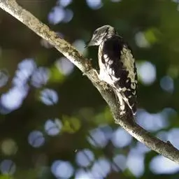 绒啄木鸟,北美洲最小的啄木鸟,白腹黑背和黑项,黑翼上有白色斑点。头部有黑白相间的条纹,尾巴短小,雄…
