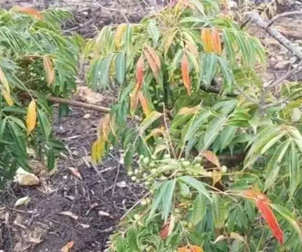 圆锥花序长7-15厘米,为叶长之半,多分枝,无毛;花黄绿色,径约2毫米;花梗长约2毫米;花萼无毛,裂片阔卵形,先端钝,长约1毫米;花瓣长圆形,先端钝,长约2毫米,中部具不明显的羽状脉或近无脉,开花时外卷;雄蕊伸出,花丝线形,长约2毫米,花药卵形,长约1毫米;花盘5裂;子房球形,径约0.8毫米,无毛,花柱1,短,柱头3裂,褐色。核果大,偏斜,径7-10毫米,压扁,先端偏离中心,外果皮薄,淡黄色,无毛,中果皮厚,蜡质,白色,果核坚硬,压扁 。