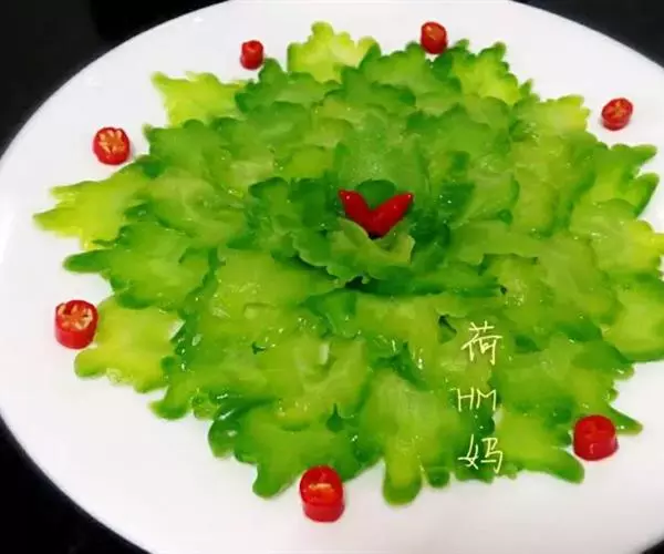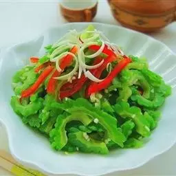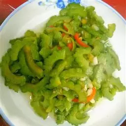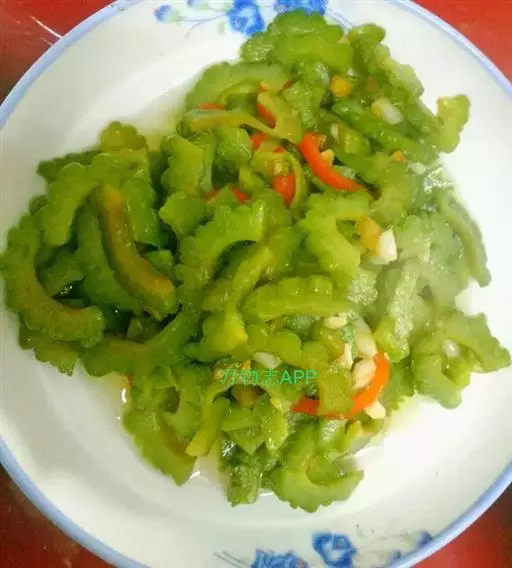 苦瓜片用盐少许稍腌,轻轻挤去部分水分,然后再炒,苦味少而味道鲜。
