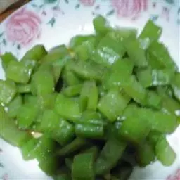 2.锅架火上,不放油,用小火分别将青椒和苦瓜片煸去水分,锅放油烧热,下入青椒、苦瓜片煸炒,继而下入精盐、味精炒匀,淋入麻油即成。