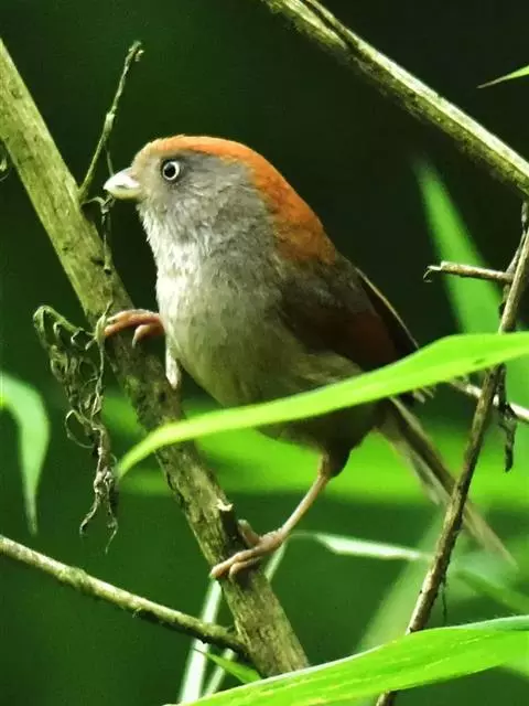 栗耳凤鹛,雌雄羽色相似。额、头顶至枕灰色,头顶有一短的不甚明显的羽冠,…