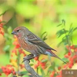 北朱雀,是燕雀科朱雀属鸟类。雄鸟额和头顶前部珠白色具窄的粉红色羽缘,…