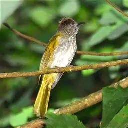 黄腹冠鹎:体长19-24厘米,是一种体型略大的褐色鹎。头顶橄榄褐色具黑褐色羽冠。白色的喉膨起,…