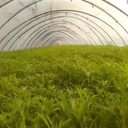 整地作畦:牡蒿塑料大棚栽培采用露地育苗移栽方式生产。采用10米宽,70米长的东西向塑料大棚。深翻土地30厘米左右,每亩施入农家肥2000千克,沿大棚南北延长向做6条长畦,畦床宽度1.3米,中间5条畦埂各30厘米宽,两边距棚脚各留35厘米作畦埂。温室内沿南北方向架设二条微喷供水管带,距地面高度为50厘米。