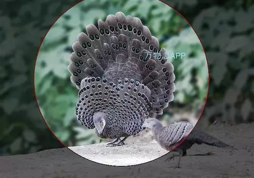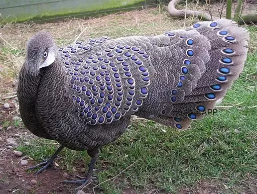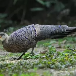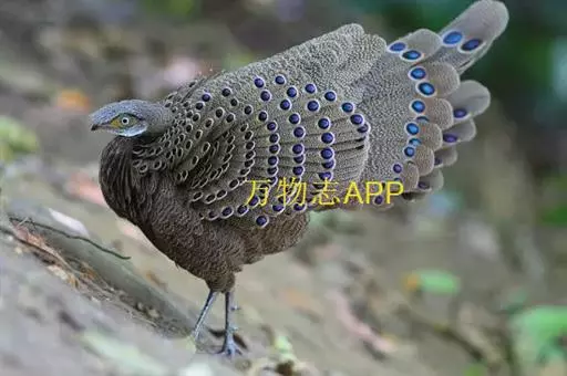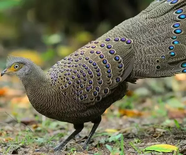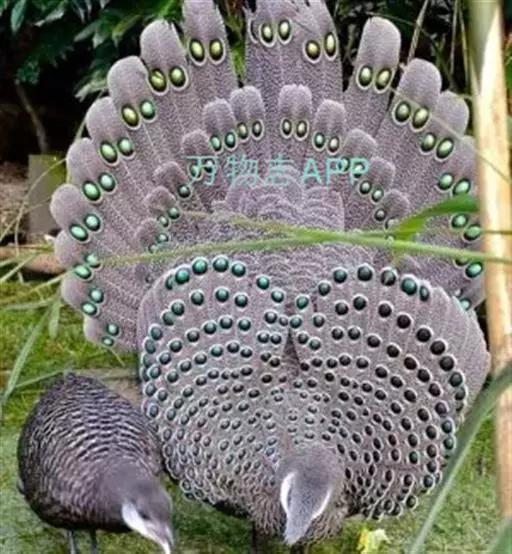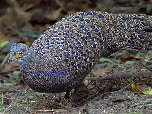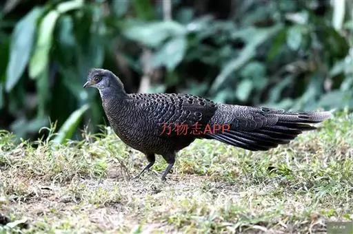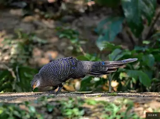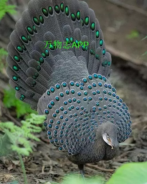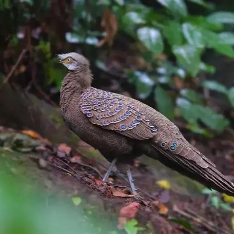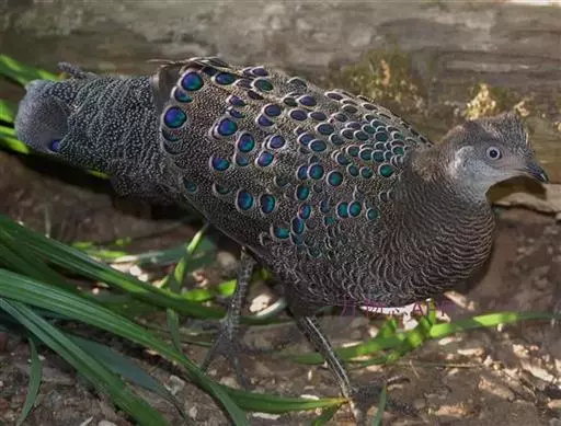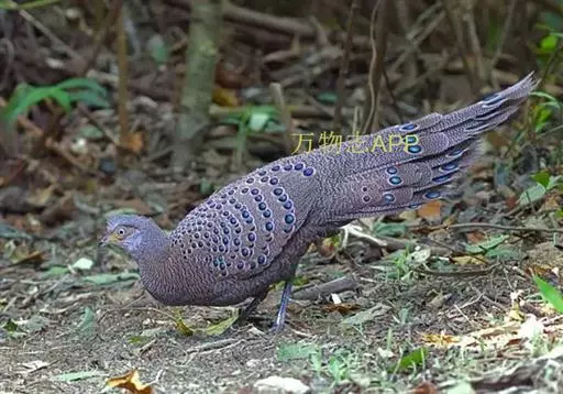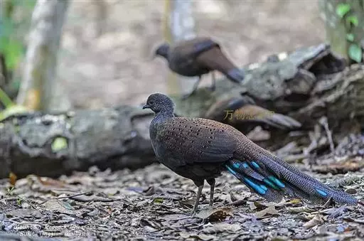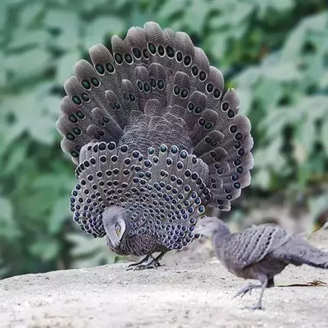 灰孔雀雉(学名:Polyplectron bicalcaratum):雄鸟体长50-67厘米,体重456-710克;雌鸟体长33-52厘米,体重460-500克。雄鸟全身羽毛黑褐色,密布几乎纯白色的细点和横斑;上背、翅膀和尾羽端部具紫色或翠绿色金属光泽的绚丽的眼状斑,象孔雀羽毛上的孔雀斑一样,故名之。雌鸟体型较小,尾羽稍短,体色与雄鸟相似而较暗,眼状斑不明显。