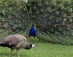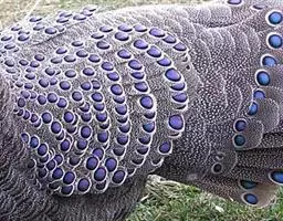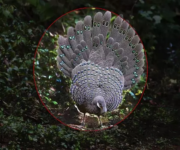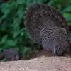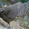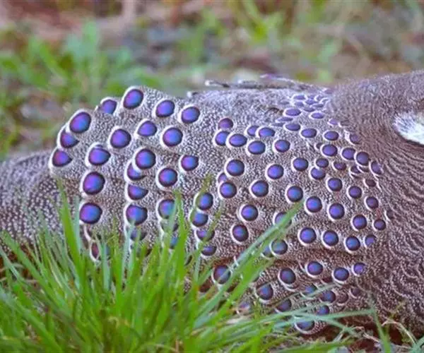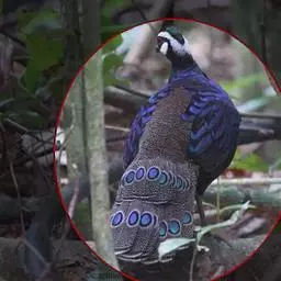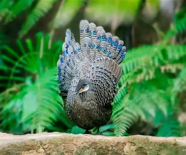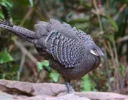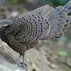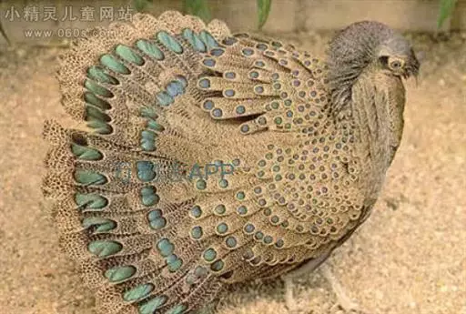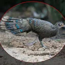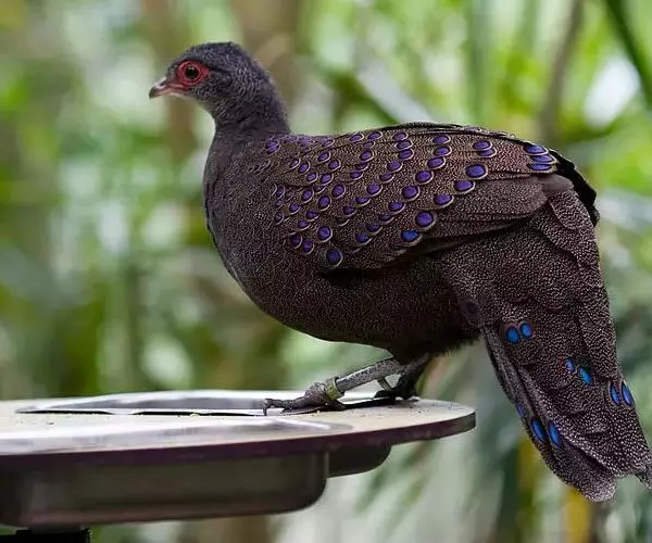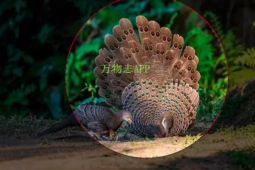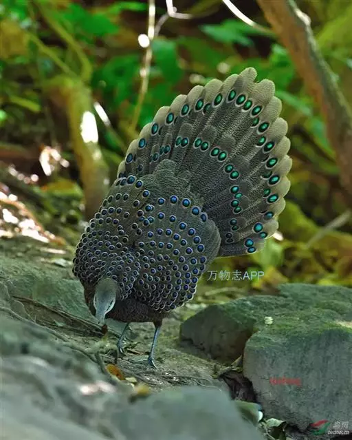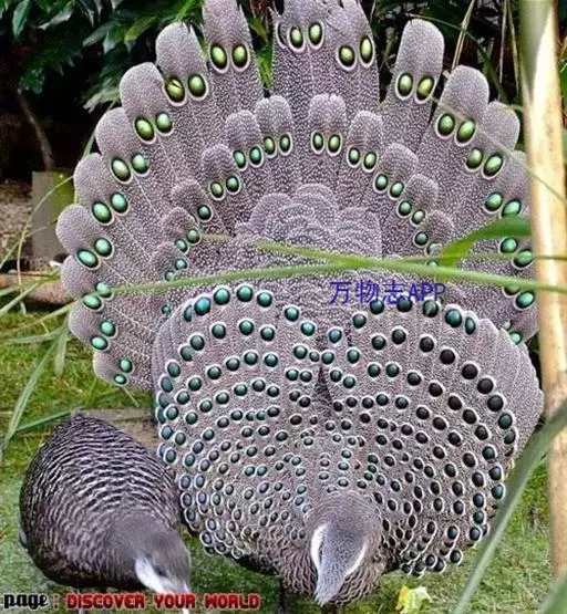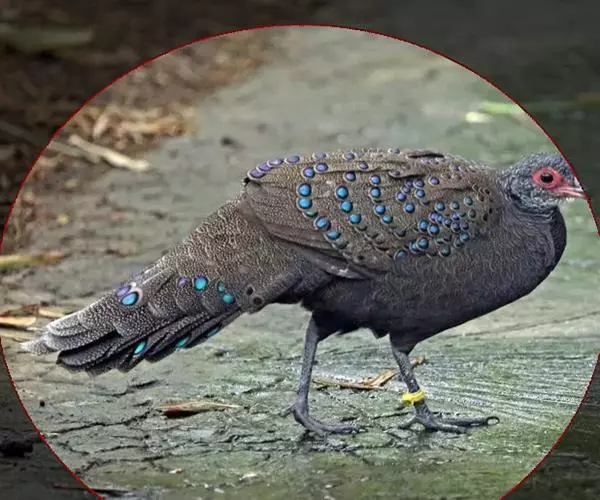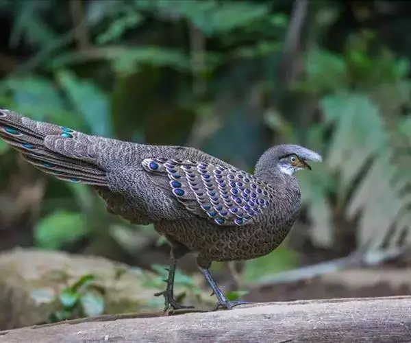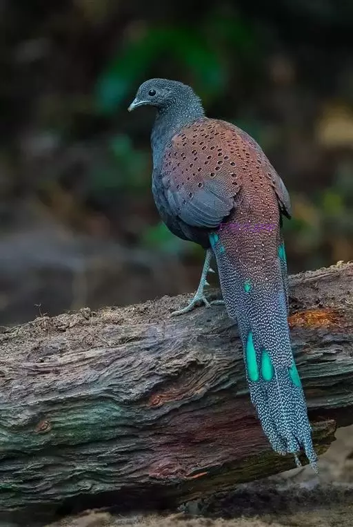 灰孔雀雉(学名:Polyplectron bicalcaratum):雄鸟体长50-67厘米,体重456-710克;雌鸟体长33-52厘米,体重460-500克。雄鸟全身羽毛黑褐色,密布几乎纯白色的细点和横斑;上背、翅膀和尾羽端部具紫色或翠绿色金属光泽的绚丽的眼状斑,象孔雀羽毛上的孔雀斑一样,故名之。雌鸟体型较小,尾羽稍短,体色与雄鸟相似而较暗,眼状斑不明显。