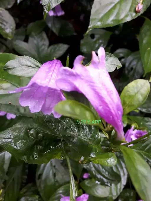叶椭圆形或卵形,长10-20(-25)厘米,先端短渐尖,基部楔形,边缘有稍粗的锯齿,两面无毛,侧脉每边约8条,在两面凸起;叶柄长1.5-2厘米。花无梗,对生,组成腋生或顶生的穗状花序,长10-30厘米;苞片对生,叶状,长1.5-2.5厘米,具短柄,最下部的比花萼长。最下部小苞片比花萼稍短;花萼不等5深裂,裂片线形,后裂片较大;花冠堇、玫瑰红或白色,花冠圆筒形,顶端内弯,喉部扩大呈窄钟形,稍弯曲,不扭弯,花冠筒短圆柱形,喉窄钟形,长为花冠筒的两倍,支撑花柱的毛排列成2列,冠檐5裂,裂片等大,倒心形,旋转状排列;雄蕊2长2短,内藏;子房上半部被毛,每室有胚珠2粒,花柱无毛。蒴果棒状,上端稍大,长2-2.2厘米,稍具4棱。种子每室2粒,卵圆形,小基区以外散生稍明显的毛。单种属。花期11月。