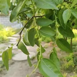 枣树 落叶小乔木,稀灌木,高达10余米;树皮褐色或灰褐色;有长枝,短枝和无芽小枝(即新枝)比长枝光滑,紫红色或灰褐色,呈之字形曲折,具2个托叶刺,长刺可达3厘米,粗直,短刺下弯,长4-6毫米;短枝短粗,矩状,自老枝发出;当年生小枝绿色,下垂,单生或2-7个簇生于短枝上。