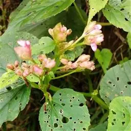 多年生草本,高17-23厘米。根状茎圆柱形,呈结节状,周围长出密集细长之根。叶均基生,具长柄;叶片两侧不相等,轮廓长卵形,长6-12厘米,宽5-8.9厘米,先端短渐尖,基部心形,两侧不相等,窄侧呈圆形,宽侧向下延长达1-2.2厘米,呈宽而圆的耳状,边缘具不等浅三角形之齿,齿尖带长芒,芒长可达3-4.5毫米,上面深绿色,散生长硬毛或近无毛,下面淡绿色,散生短柔毛,沿脉较密,掌状6-7条脉,上面不明显,下面明显突起;叶柄长4-11.2厘米,有棱,密被褐色长硬毛,上部更密;托叶膜质,褐色,早落。花葶高10-13厘米,具棱,近无毛。花2朵,生于茎顶;花梗长1.2-2.1厘米,具棱近无毛;雄花:花被片4,外轮2枚长圆状卵形,长约1.3厘米,宽约8毫米,先端圆钝,内轮花被片2,长圆状披针形,长约9毫米,宽约3.5毫米;雄蕊多数,整体呈椭圆形,花丝长约2毫米,花药长圆形;雌花未见。蒴果3翅,一翅特大,呈宽披针形,长1.5-2.5厘米,先端圆,无毛,有明显脉纹,其余2翅较窄,长约3.5毫米,呈新月形。花期5月,果期8月。 [1-2]