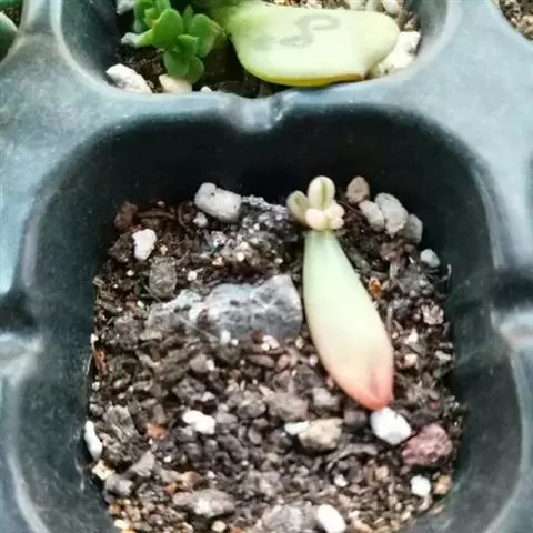 叶子表面宽厚,富肉质感且带有磨纱质感,看像石头质地;开红色小花,生于植株顶部,倒伞形密生,形状像花…