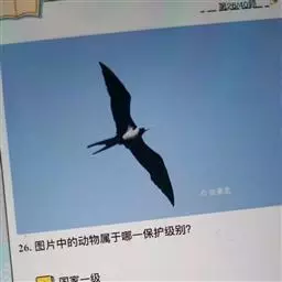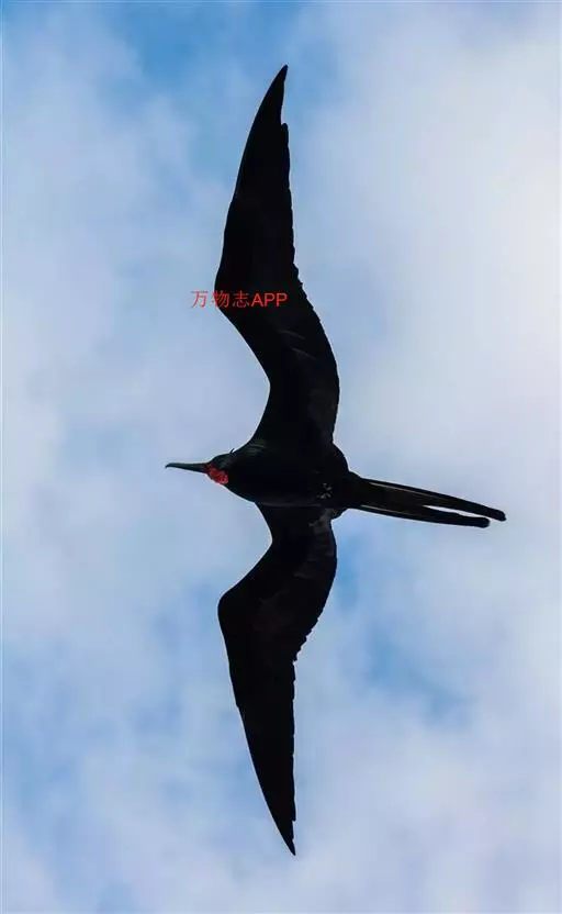 阿岛军舰鸟 阿岛军舰鸟体形轻盈,翼展宽阔,善展翅滑翔。和其他军舰鸟一样:有很长的深叉形尾巴,嘴尖弯曲成钩状,尖翅显著。 阿岛军舰鸟大型海鸟,体长89~96厘米。成年雄鸟全身黑色,且具绿色和紫色的油亮光泽。喉囊鲜红色,求偶期会鼓胀如心形气球状。成年雌鸟偏锈棕色,尤其在颈、胸周围最为明显,某些个体的胸、腹部会出现白色斑块。 幼鸟与成年雌鸟外形相似,幼鸟头部白色是主要的区别特征。