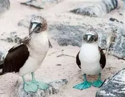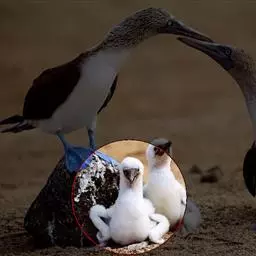 阿岛军舰鸟雏鸟 阿岛军舰鸟全年可繁殖,5~10月为产卵高峰期。在求偶期,雄鸟聚集成群,将鼓胀喉囊指向飞越其领地的雌鸟,每只雄鸟都半展翅膀,全身有节奏地颤动,同时发出喧闹的“嗒嗒”声。 交配后,雌鸟将卵产在由鹅卵石、羽毛和骨头构筑的低浅巢穴中。孵卵期约44天。雏鸟6或7个月羽毛丰满,可以飞行,但仍由双亲喂食数月。繁殖成功率低,繁殖期的雌鸟每两年产卵不多于一枚。
