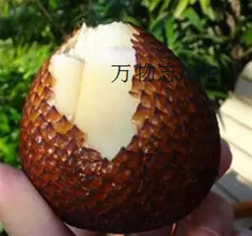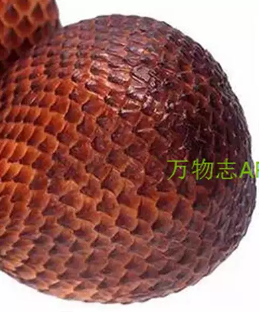 功效:蛇皮果的果肉是白中带黄色,咬下去是很爽脆的感觉,而肉质很乾硬,非常的酸涩。蛇皮果果肉含对人体皮肤有益成分,印尼本地姑娘经常将它作为美容水果食用。它是水果中钾含量最高的品种之一,果胶含量也很丰富,对人脑十分有益,有“记忆之果”的美誉。
