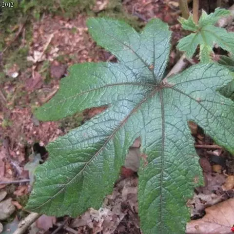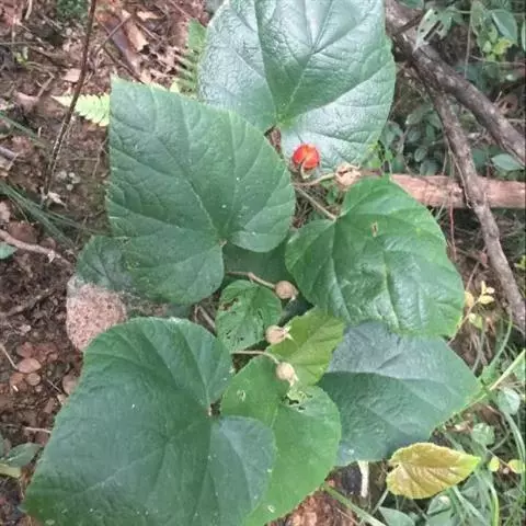 掌叶覆盆子(学名:Rubus chingii Hu)是蔷薇科悬钩子属植物,藤状灌木,高1.5-3米;枝细,具皮刺,无毛。单叶,近圆形,直径4-9厘米,两面仅沿叶脉有柔毛或几无毛,基部心形。单花腋生,无毛;萼筒毛较稀或近无毛;萼片卵形或卵状长圆形,顶端具凸尖头。果实近球形,红色,直径1.5-2厘米,密被灰白色柔毛。花期3-4月,果期5-6月。