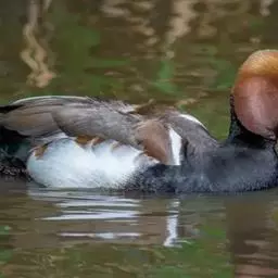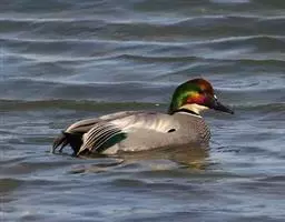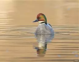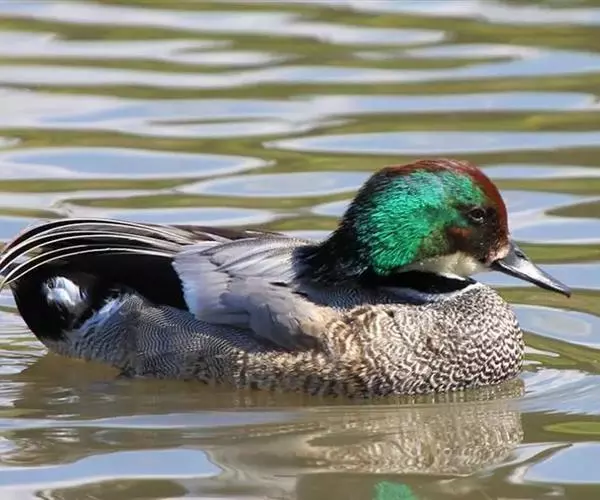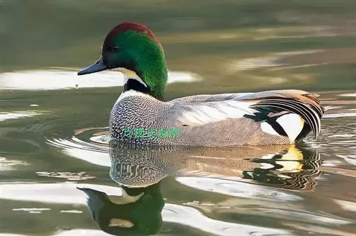 罗纹鸭(学名:Anas falcata)是中型鸭类,体型略较家鸭为小,体长40-52厘米,体重0.4-1千克。雄鸭繁殖期头顶暗栗色,头侧、颈侧和颈冠铜绿色,额基有一白斑;颏、喉白色,其上有一黑色横带位于颈基处。三级飞羽甚长,向下垂,呈镰刀状;下体满杂以黑白相间波浪状细纹;尾下两侧各有一块三角形乳黄色斑。明显有别于其他鸭类,野外容易鉴别。雌鸭略较雄鸭小,上体黑褐色,满布淡棕红色‘U’形斑。下体棕白色,满布黑斑。主要以水藻、水生植物嫩叶、种子、草子、草叶等植物性食物为食。繁殖在西伯利亚东部、远东、中国黑龙江省和吉林省。越冬在中国、朝鲜、日本、中南半岛、缅甸、印度北部。