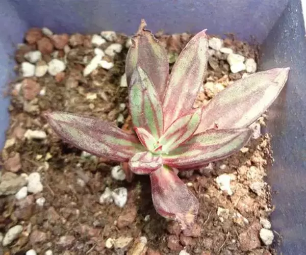 茎部短缩,叶序莲座型排列,株径5~10㎝。叶片匙形或长卵型,叶色灰绿或黄绿,叶背中央、叶缘与叶面有深红色斑纹是最大特徵。浅橘色钟型花朵,夏季开花。