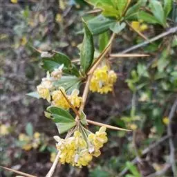 庐山小檗(学名:Berberis virgetorum Schneid.)是小檗科,小檗属落叶灌木,高可达2米。幼枝紫褐色,老枝灰黄色,茎刺单生,偶有三分叉,叶薄纸质,长圆状菱形,叶缘平展,有时稍呈波状;总状花序,花梗细弱,无毛;苞片披针形,花黄色;外萼片长圆状卵形,内萼片长圆状倒卵形,花瓣椭圆状倒卵形,浆果长圆状椭圆形,熟时红色,花期4-5月,果期6-10月。