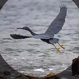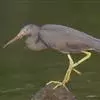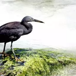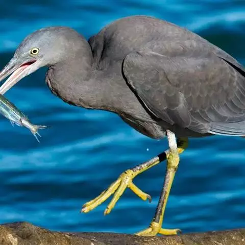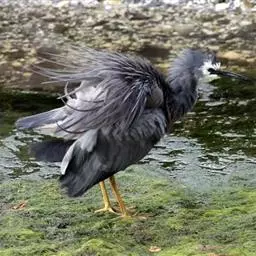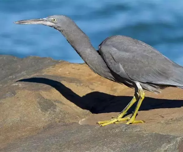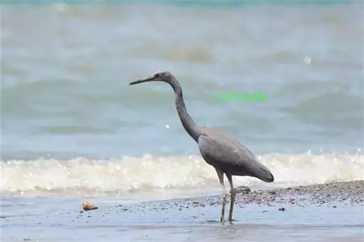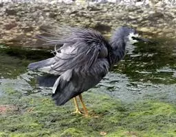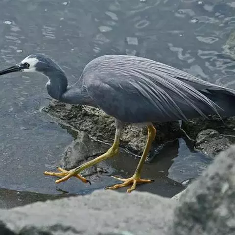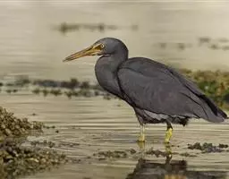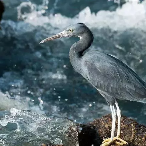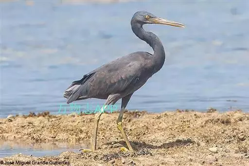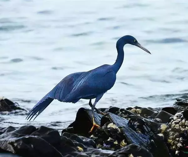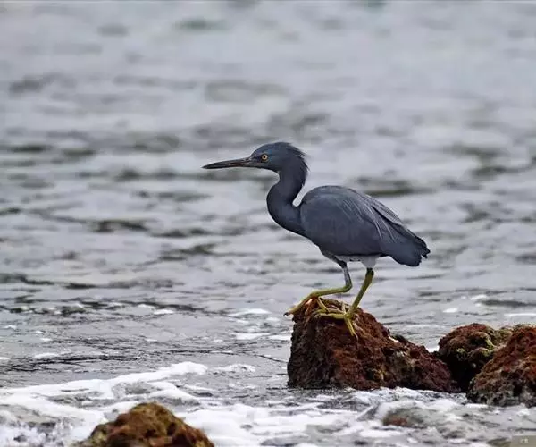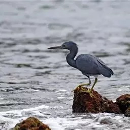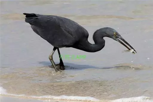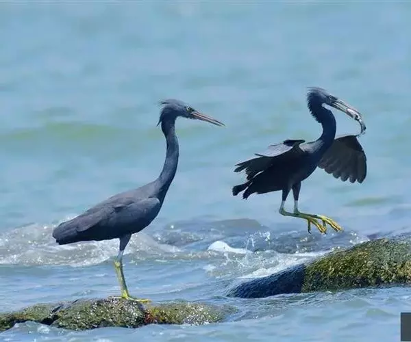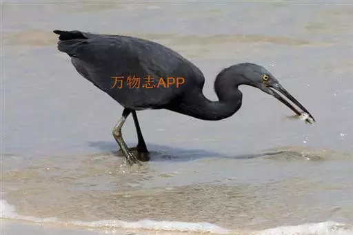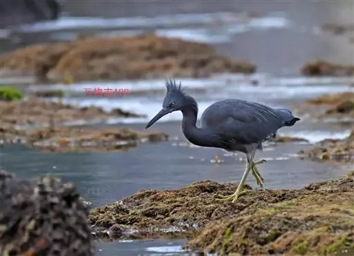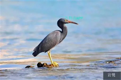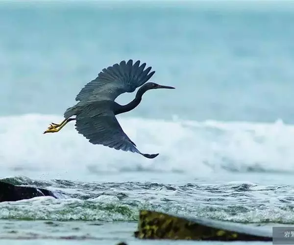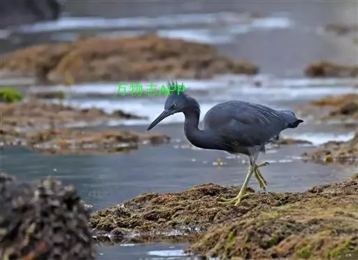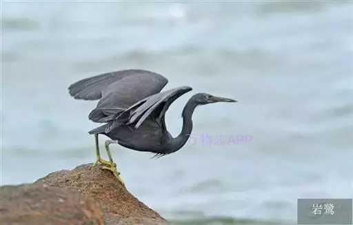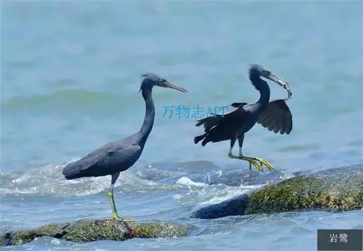 岩鹭(学名:Egretta sacra):中型涉禽,体长60-75厘米,翼长25-30毫米,体重330-700克。嘴较长而粗钝,颈长,脚较粗短,体色有白色和黑色两种色型。黑色型较常见,体羽清一深灰色并具短冠羽,近白色的颏在野外清楚可见。白色型与牛背鹭的区别在体型较大,头及颈狭窄。与其他鹭的区别为腿偏绿色且相对较短,嘴浅色,习性也不同。虹膜黄色;嘴浅黄;脚绿色。