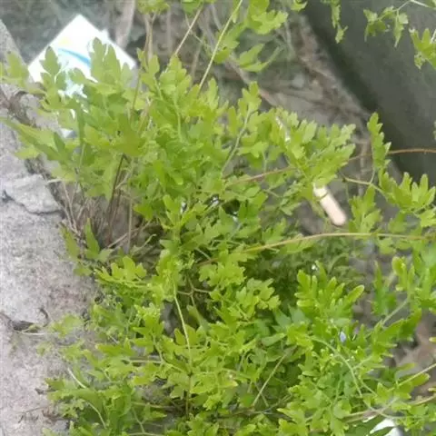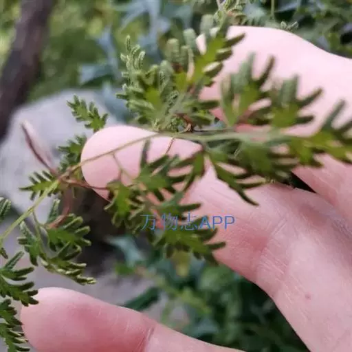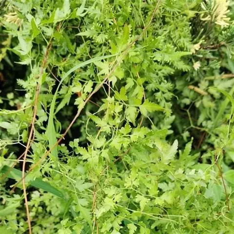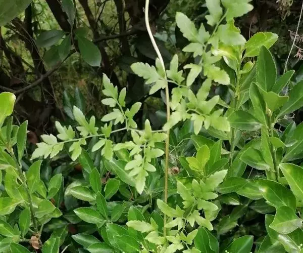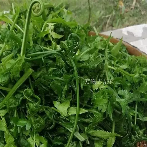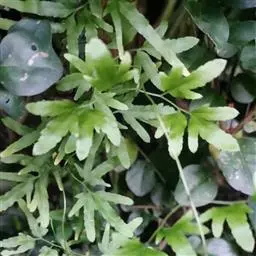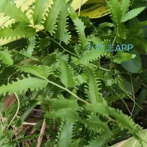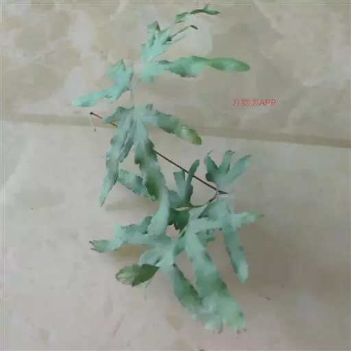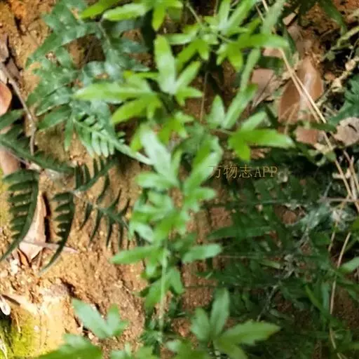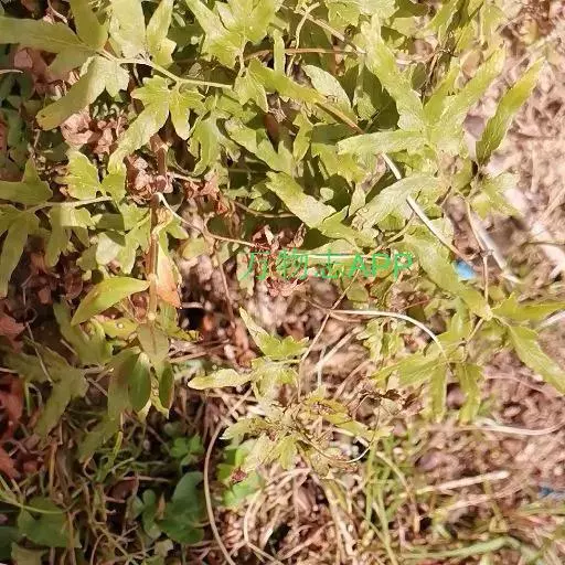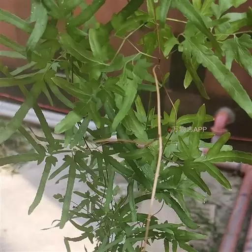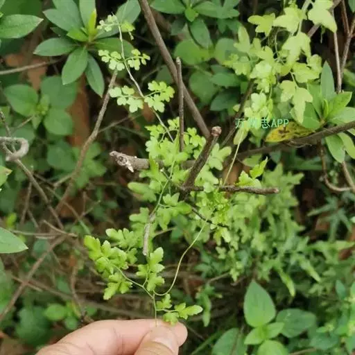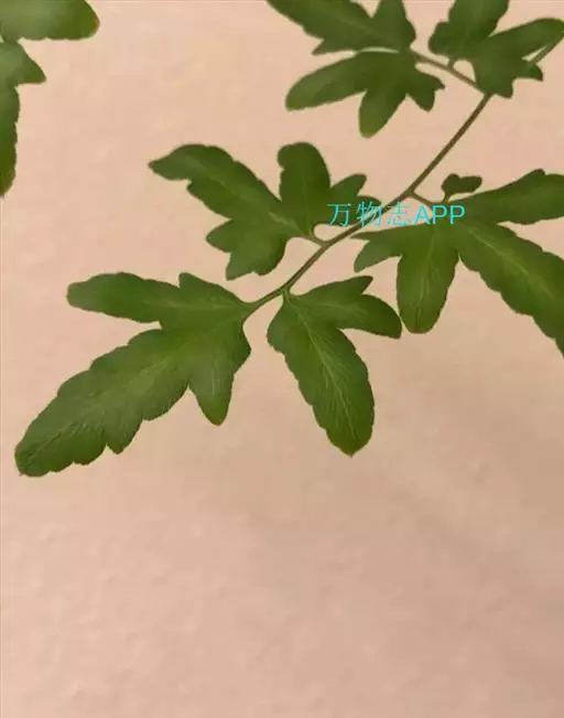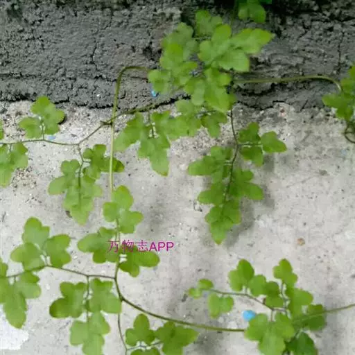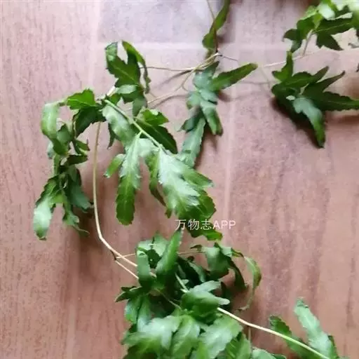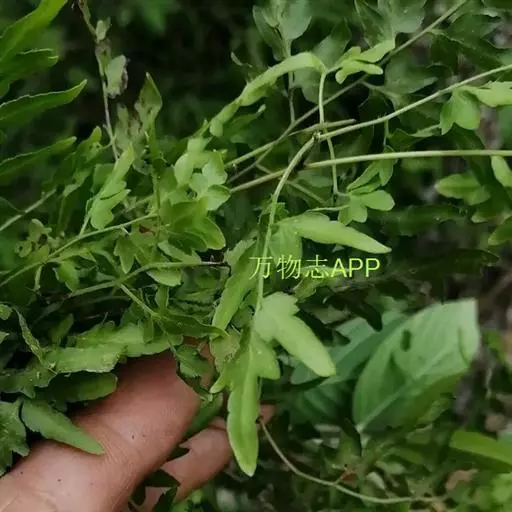 多年生草质藤本,长1~5m。根状茎横走,生黑褐色有节的毛;根须状,黑褐色,坚韧,亦被毛。叶多数,对生于茎上的短枝两侧,二型,纸质,连同叶轴和羽轴有疏短毛:营养叶尖三角形,长、宽各10~300px,二回羽状,小羽片掌壮或3裂,宽3~8mm,边缘有不整齐的细钝锯齿,孢子叶卵状三角形,长、宽各10~500px,多收缩而呈深撕裂状。夏末,小羽片下面边缘生流苏状的孢子囊穗,穗长2~5mm,黑褐色,孢子表面有小疣。