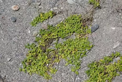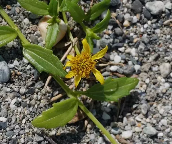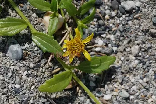 一年生草本。茎匍匐,长25~80cm或更长;基部茎节生不定根,节间长2~4cm,或在上部可达6~8cm;茎圆形,密被短糙毛,糙毛有时成钩状。叶对生;叶无柄或有1~5mm长短柄;叶片披针形或长圆状披针形,连叶柄长1~4cm,宽4~9mm,先端钝,基部稍狭,边缘有1~3对不规则粗齿或细齿,稀全缘,两面密被基部为疣状的短糙毛,中脉和近基发出的1对侧脉,不明显,无网状脉。头状花序少数,径约10mm,单生茎顶或上部叶腋,无花序梗或有长1~6mm花序梗;总苞近球形,径约9mm;总苞片2层,外层叶质,绿色,卵形至卵状长圆形,长4~6mm,先端钝或略尖,内层倒卵形或倒卵状长圆形,长约6mm,先端三角状短尖;托片折叠成倒卵状长圆形,长6~7mm,基部较狭,先端短尖;舌状花1层,黄色,舌片长圆形,长7~9mm,宽约3mm,先端3浅裂,管部约与子房等长;管状花黄色,长6~7mm,向上渐扩大成钟状,檐部5裂,裂片近三角形,先端稍钝,疏被短毛。瘦果倒卵状三棱形,长约4mm,宽2.5~3mm,先端截平,但中央稍凹入,凹入处密被短毛;无冠毛及冠毛环。花期6~10月。