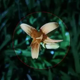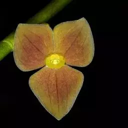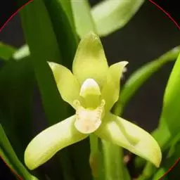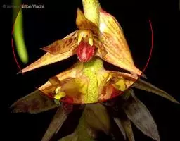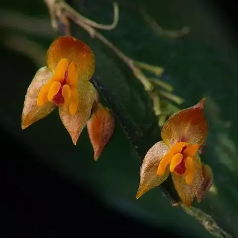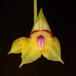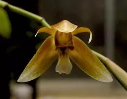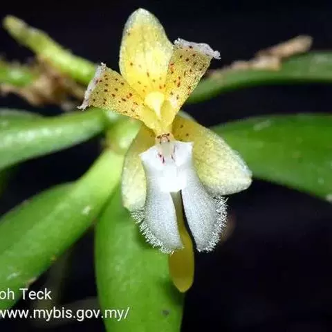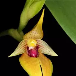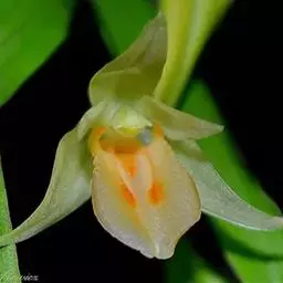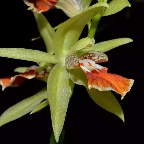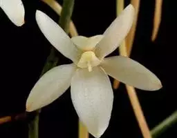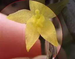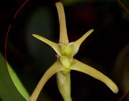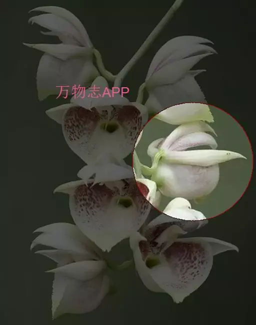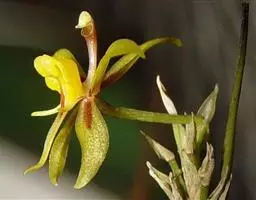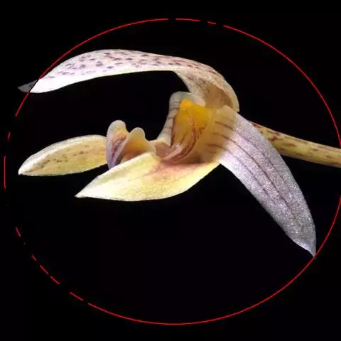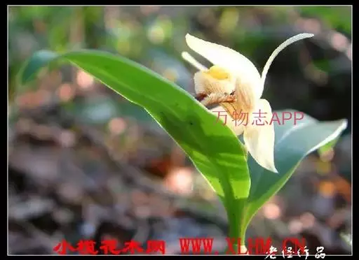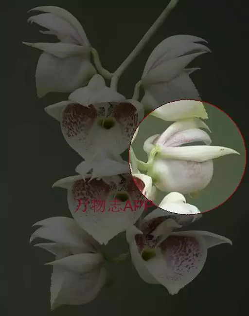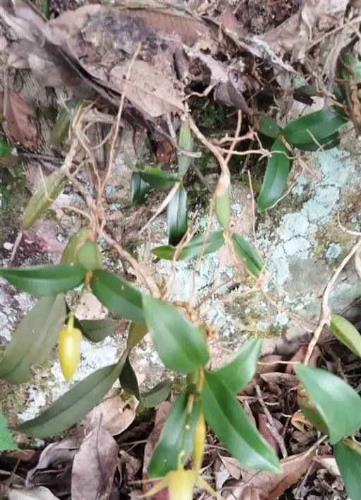 花葶从已长成的假鳞茎顶端发出,长5-10厘米,基部套叠有数枚圆筒形的鞘;鞘紧密围抱花葶;总状花序通常具1-2朵花,但同一时间只有1朵开放;花序轴顶端为数枚白色苞片所覆盖;花苞片早落;花梗和子房长1-1.2厘米;花淡黄色或近白色,仅唇瓣上有红色斑纹;萼片长圆状披针形,长1.6-2厘米,宽4-7毫米。