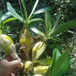 流苏贝母兰根状茎较细长,匍匐,粗1.5-2.5毫米,节间长3-7毫米。假鳞茎在根状茎上相距2-4. 5 (-8 )厘米,狭卵形至近圆柱形,长2-3 (-4.5 )厘米,粗5-15毫米,干后无光泽,顶端生2枚叶,基部具2-3枚鞘;鞘卵形,长1-2厘米,老时脱落。叶长圆形或长圆状披针形,纸质,长4-10厘米,宽1-2厘米,急端急尖;叶柄长1-1.5(-2)厘米。