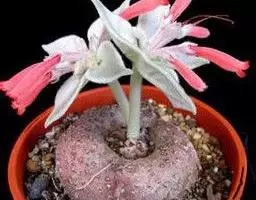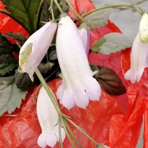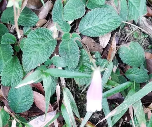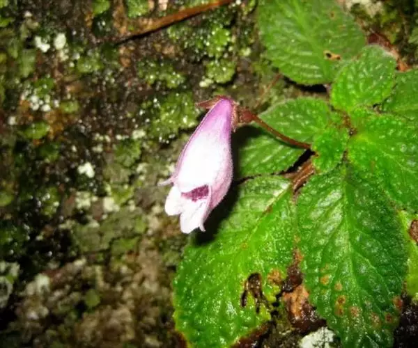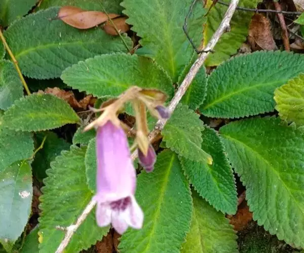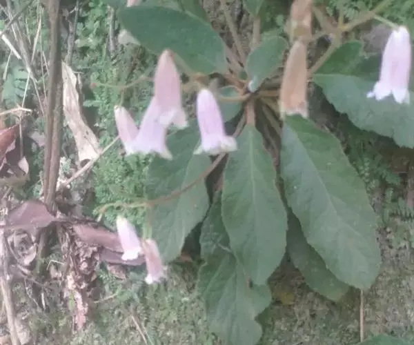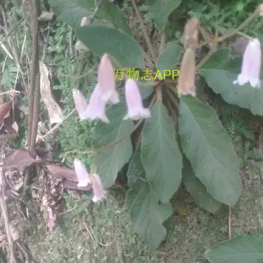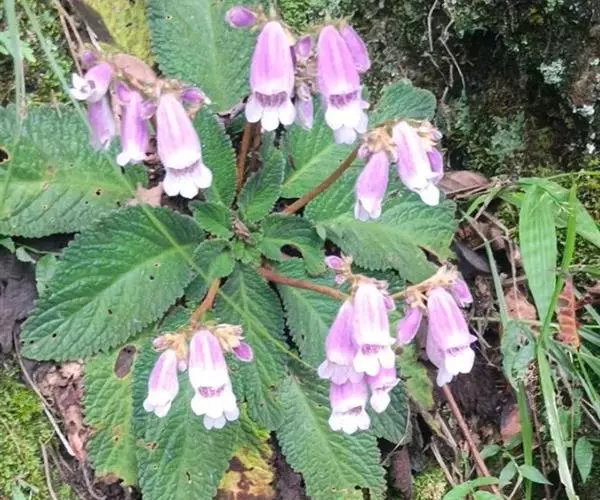 聚伞花序生茎顶端叶腋,花序梗和花梗均被白色柔毛,具1-2花;苞片2(-3),狭线形,长2-4毫米,宽约1毫米,顶端钝或稍渐尖;花梗长1-1.3厘米。花萼5裂至近基部,裂片线状披针形,长1-1.8厘米,宽2-3毫米,顶端长渐尖,外面疏生白色贴伏柔毛,内面无毛,多全缘,稀上部具2-3小齿。花冠粗筒状,下方肿胀,长3.8-4.2厘米,黄色,稀白色,外面近无毛;筒长2.8-3厘米,直径1.5-1.8厘米;上唇2裂,裂片近圆形,相等,长约5毫米,下唇3裂,内面具紫色斑点,中央裂片较大,长9-10毫米,侧裂片较小,长2.8-3毫米。上雄蕊长2.5厘米,着生于距花冠基部4毫米处,下雄蕊长3厘米,着生于距花冠基部5毫米处,花丝无毛,花药卵圆形,长1.5-2毫米,药室顶端不汇合;退化雄蕊长约2毫米,着生于距花冠基部3毫米处。花盘环状,高1.5-2毫米,近全缘。