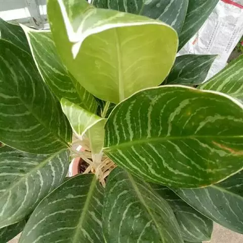 叶椭圆形或卵圆形,长20~30厘米,宽15~20厘米,叶稍厚带革质,光滑而富光泽,叶面青绿色,叶脉青绿色,中脉浅绿色至粉红色,羽状侧脉两侧间隔着斜向上的浅绿色斑条,叶脉侧则排列着墨绿色浅条,叶脉和沿叶缘呈黄色条纹,犹如披上金链;近叶缘处有一圈玫瑰色或银白色环形斑纹,如同一条彩虹,叶背具紫红斑块。