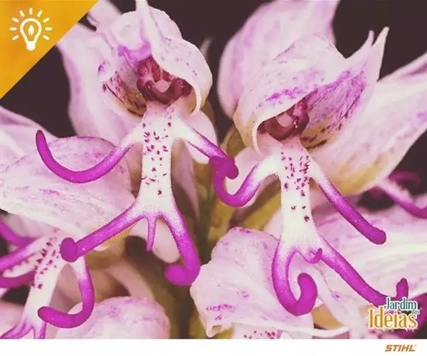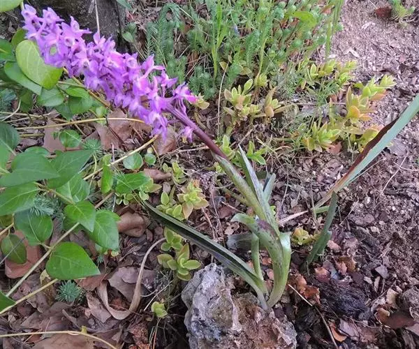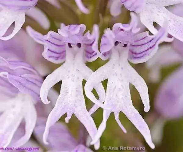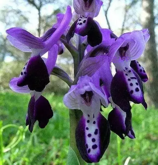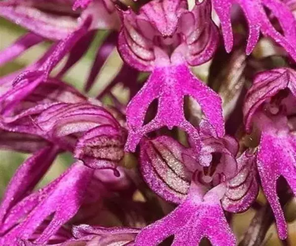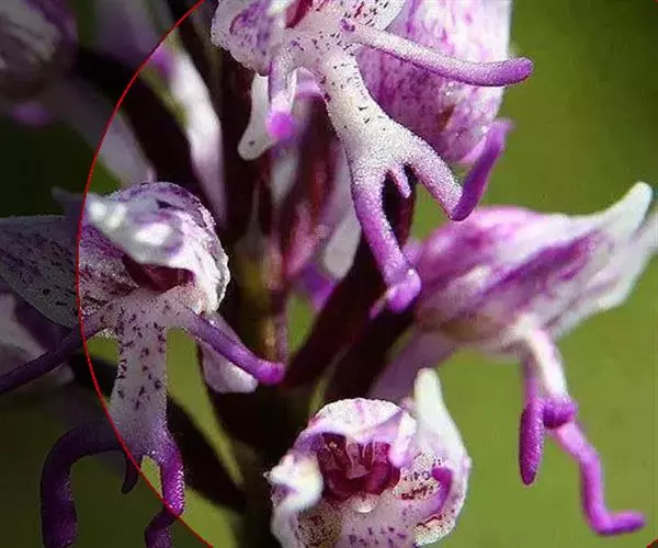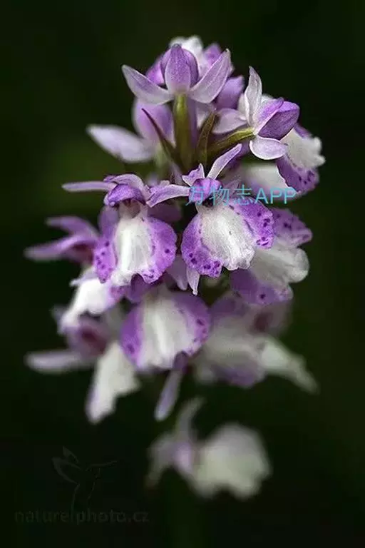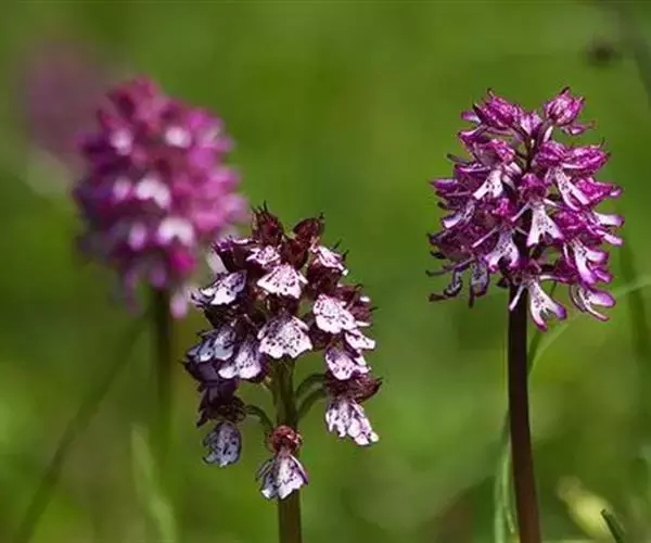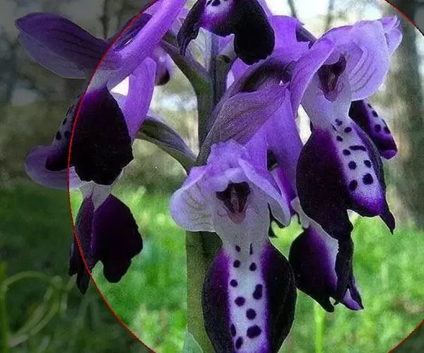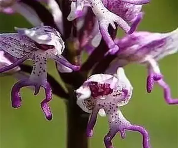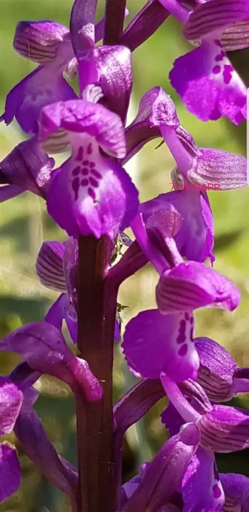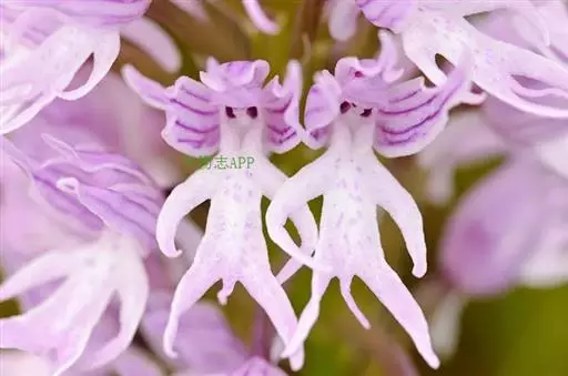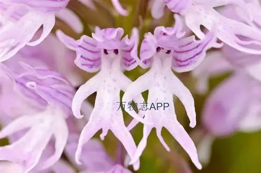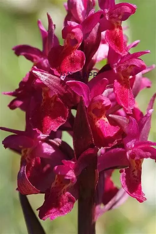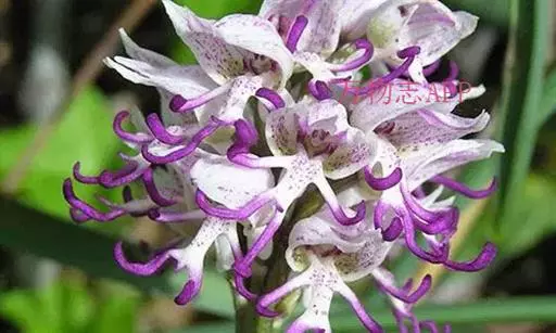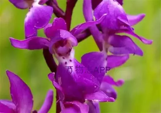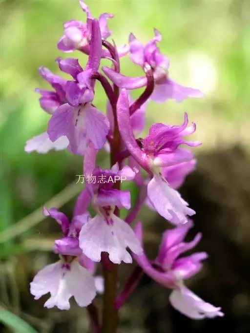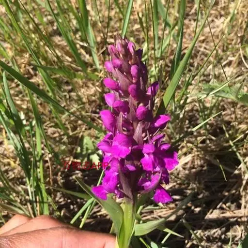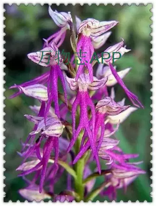 广布红门兰(学名:Orchis chusua D. Don):植株高5-45厘米。块茎长圆形或圆球形,肉质,不裂。茎直立,圆柱状。叶片长圆状披针形、披针形或线状披针形至线形,上面无紫色斑点。花序具1-20余朵花,多偏向一侧;花紫红色或粉红色;花瓣直立,斜狭卵形、宽卵形或狭卵状长圆形,长5-7毫米,宽3-4毫米,先端钝,边缘无睫毛,前侧近基部边缘稍臌出或明显臌出,具3脉;唇瓣向前伸展,较萼片长和宽多,边缘无睫毛,3裂。花期6-8月。